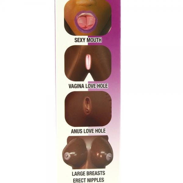 Waterproof PVC love doll in the missionary position has a mouth, vagina and anus, as well as large breasts with erect nipples. Features glow in the dark erogenous zones, hair, lips, eyebrows and stockings. Doll is 58.3 inches tall.