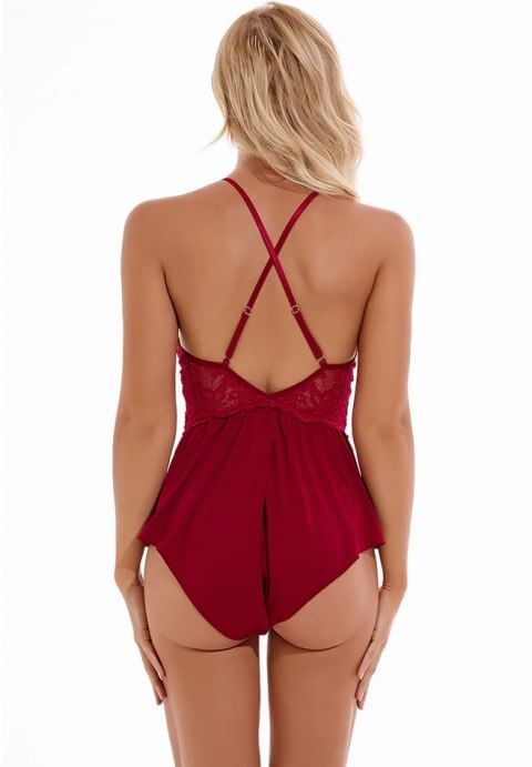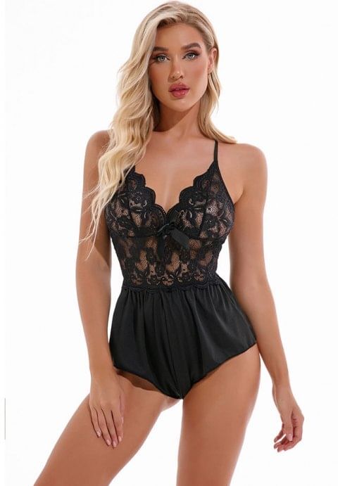 Seduce with subtle sexiness in this cute mesh romper featuring a V-neckline with a scalloped lace trim, sheer lace cups, satin bow accents, adjustable criss-cross spaghetti straps with a low open back, an open crotch, and an open, cheeky cut back.